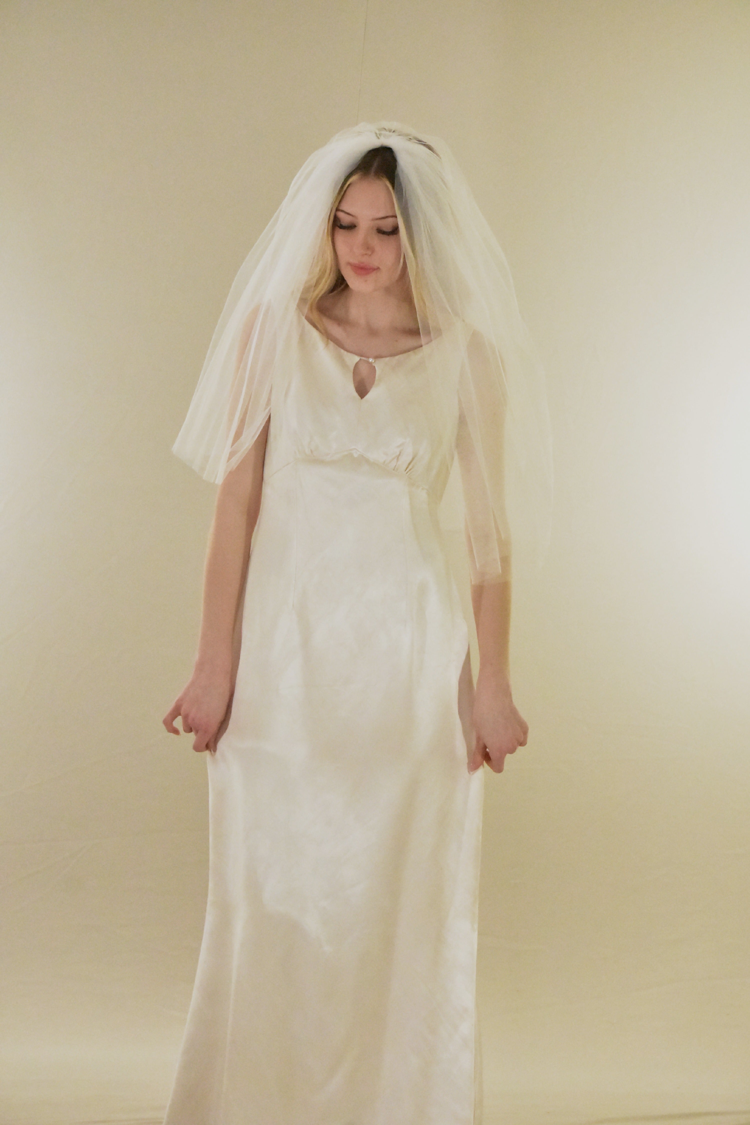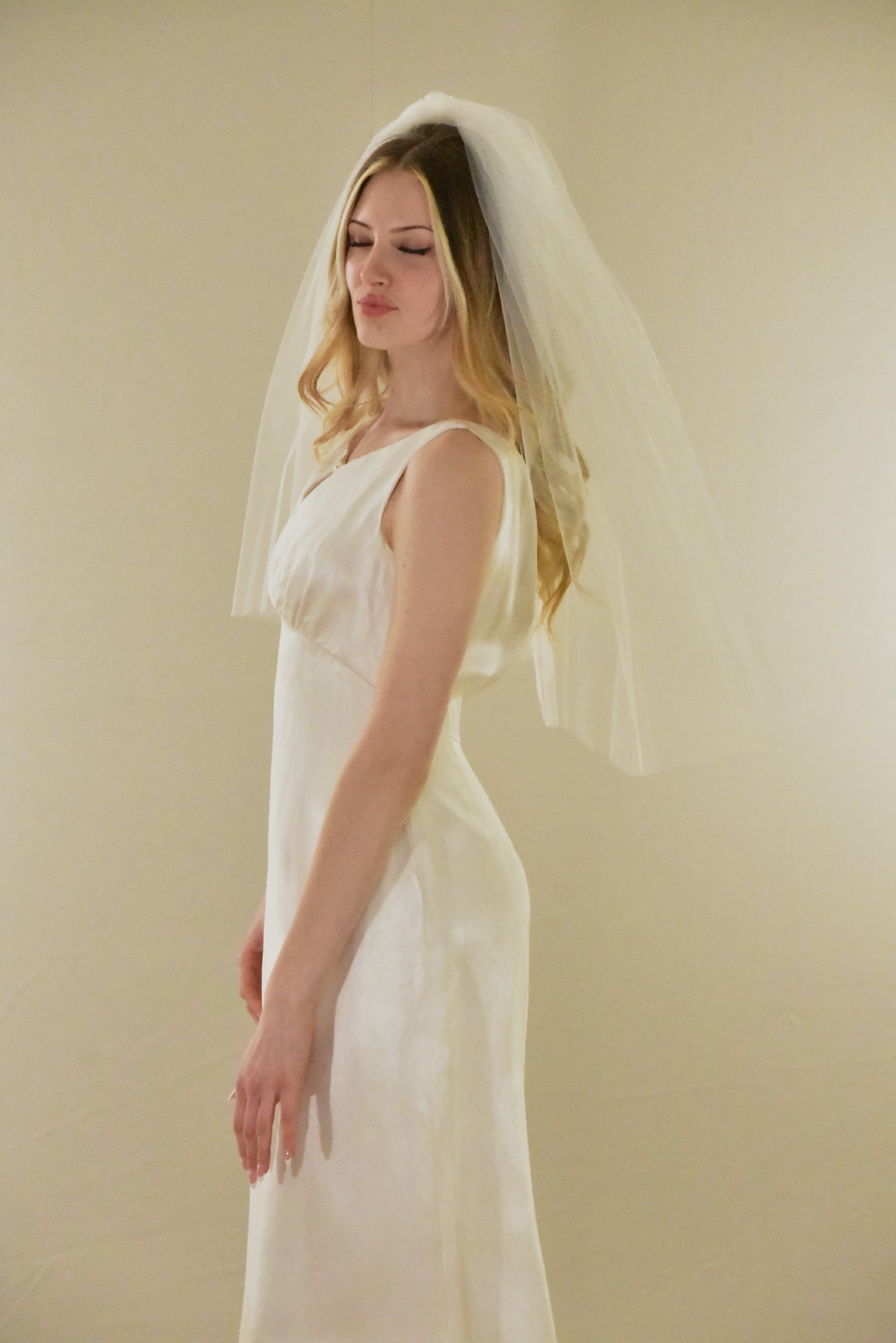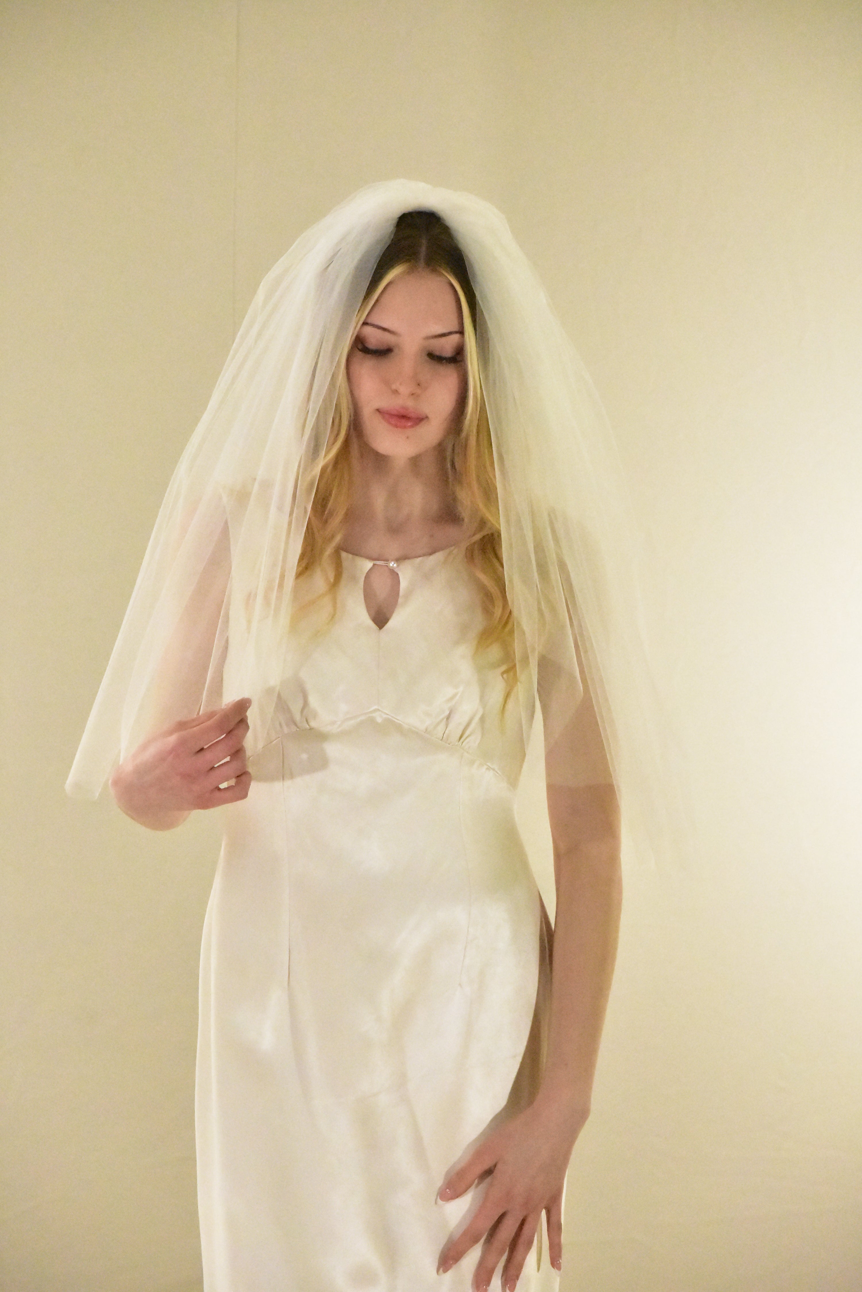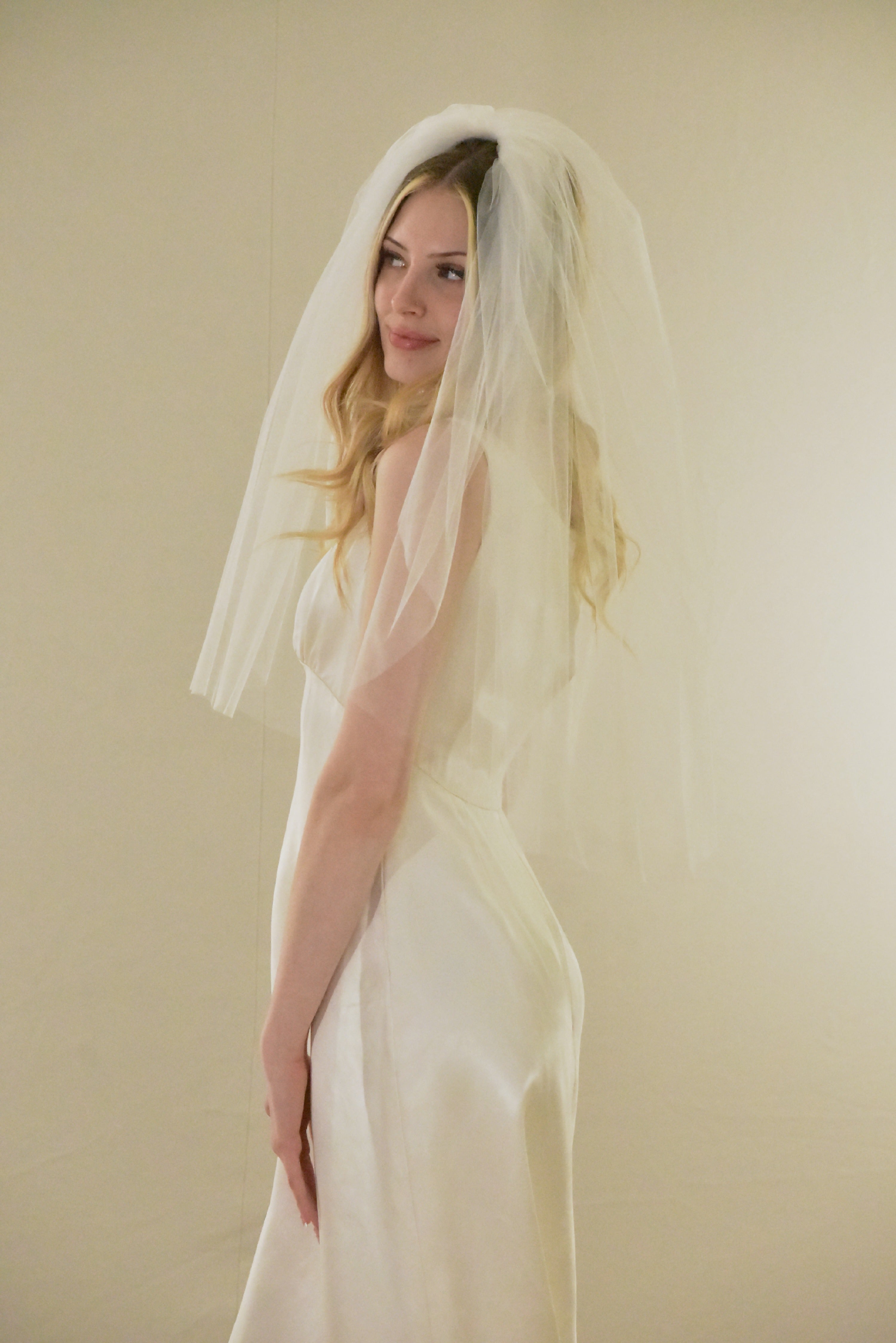 Embrace timeless elegance with this vintage-inspired elbow veil, crafted to add dramatic volume and romantic flair to your bridal look.